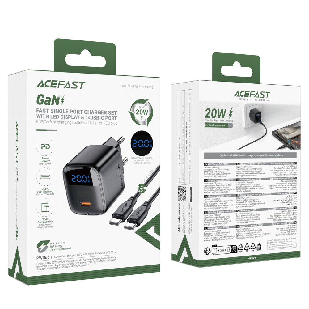 Az Acefast A113 fali töltő egy kompakt és modern, 20W-os készülék, amely gyors töltést támogató USB-C csatlakozóval rendelkezik. A GaN technológia biztosítja a magas hatékonyságot, a csökkentett hőtermelést és a hosszabb élettartamot, míg a digitális LED kijelzőn látható az aktuális töltési teljesítmény és a gyorstöltési mód állapota. Széles körű kompatibilitásának és a többféle protokoll támogatásának köszönhetően a töltő a legtöbb okostelefonnal, táblagéppel és kiegészítővel működik. A csomaghoz tartozik egy 1,2 m-es USB-C–USB-C kábel is, amely lehetővé teszi a készülék teljes teljesítményének kihasználását.