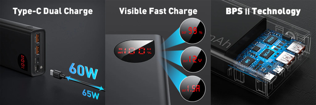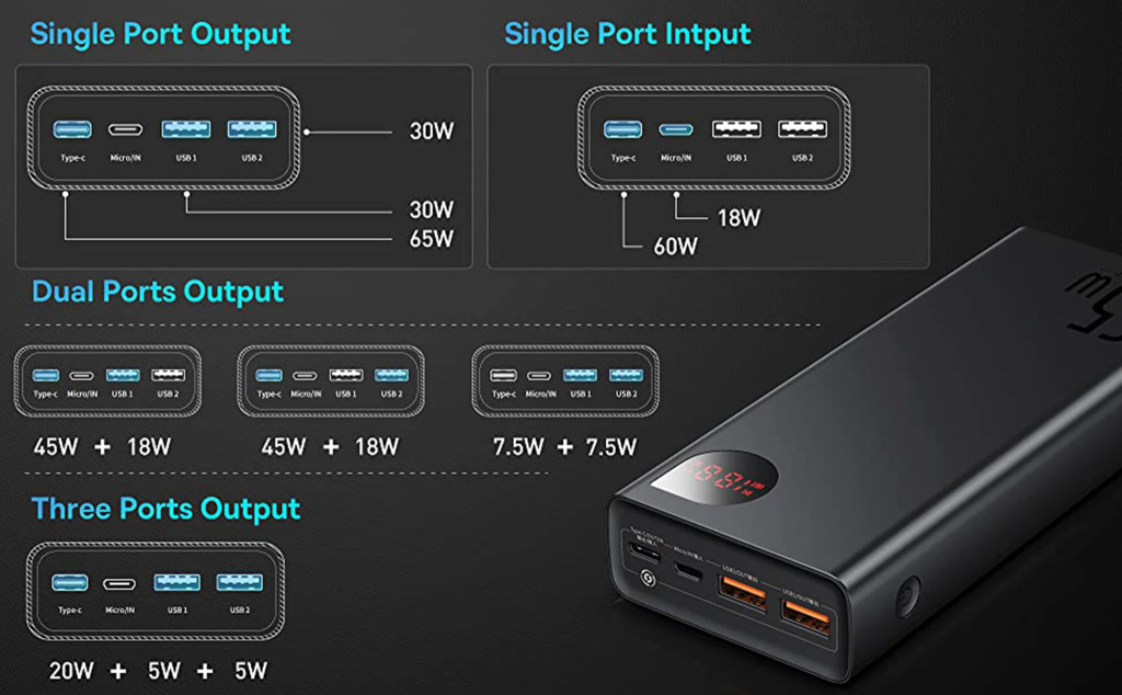 Az akkumulátor kapacitása 20 000 mAh, és mindössze 2 óra alatt feltölthető. Az energia megújítása kétféleképpen lehetséges - gyors USB-C vagy a Micro USB port segítségével. A hatás mindig ugyanaz. A házon található elektronikus LED-kijelző tájékoztat a töltés állapotáról.
