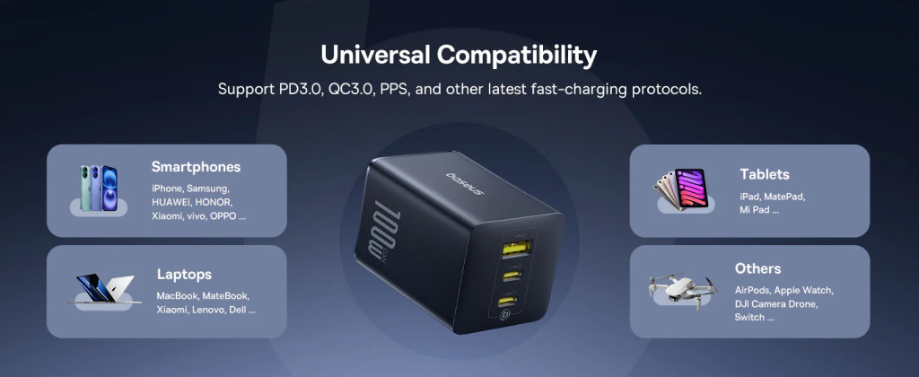 - 100W teljesítmény: laptopok, okostelefonok és táblagépek gyors töltése.