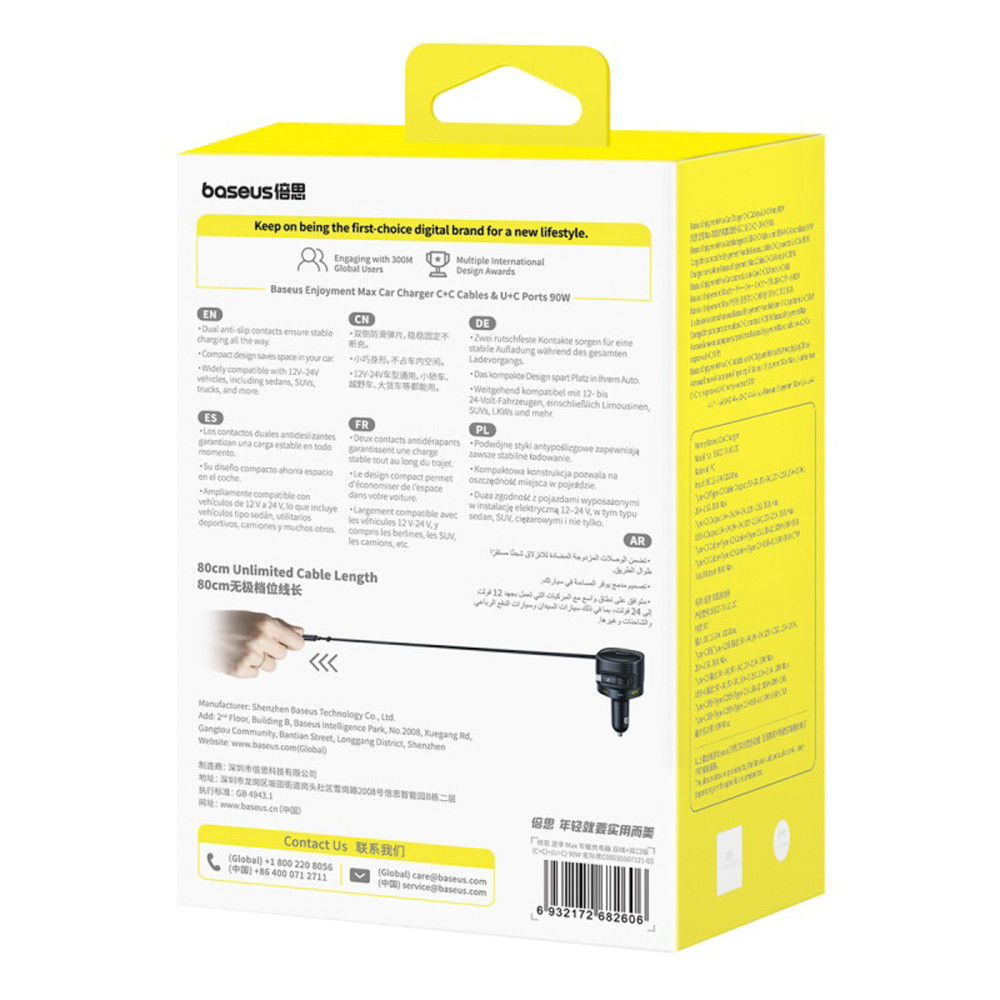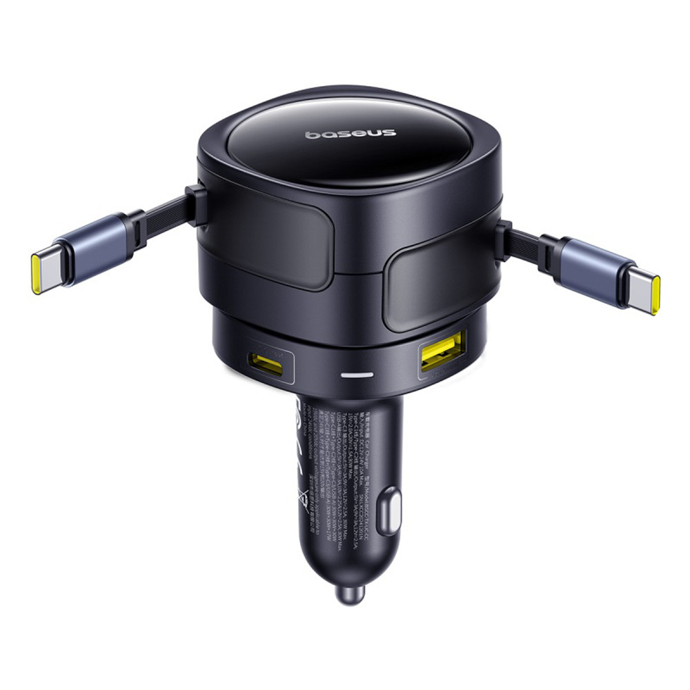 A Baseus Enjoyment Max 90W egy fejlett, négyportos autós töltő, amely lehetővé teszi akár négy eszköz gyors és biztonságos töltését egyidejűleg. Két beépített, automatikusan visszahúzható 80 cm-es USB-C kábellel felszerelve biztosítja a kényelmes, gubancmentes töltést. A 180°-ban elforgatható kialakítás lehetővé teszi a kábel irányának szabad beállítását, a LED-jelző pedig megkönnyíti a sötétedés utáni használatot. A készülék több gyorstöltési protokollt támogat, beleértve a Power Delivery (PD), a Quick Charge (QC), a SuperCharge (SCP) protokollokat. A csúszásmentes rugókkal ellátott megerősített kialakítás egyenetlen terepen is stabilitást biztosít. Kompatibilis a 12-24V-os járművekkel, azaz alkalmas személygépkocsikhoz, terepjárókhoz és teherautókhoz.