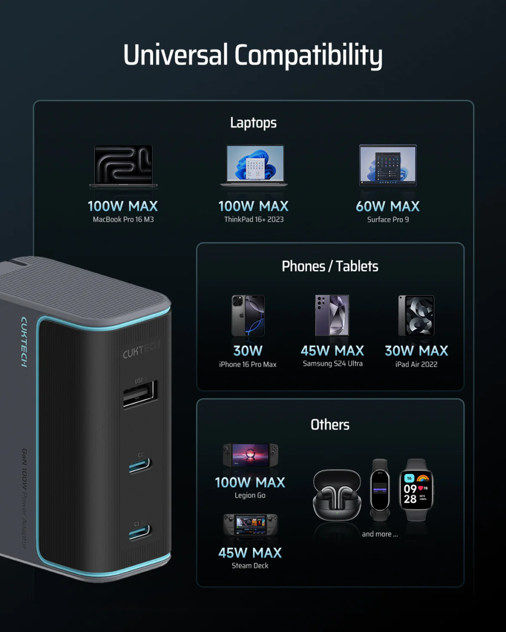 A Cuktechnagy teljesítményű, akár 100W-os GaN fali töltője, amely otthonra, irodába és utazáshoz egyaránt tökéletes. Két USB-C és egy USB-A porttal felszerelve akár három eszközt is egyszerre tölthet, beleértve a laptopokat, okostelefonokat, táblagépeket és konzolokat. Támogatja a PD, QC és PPS protokollokat, intelligensen szabályozva az áramellátást a csatlakoztatott eszközökhöz. A GaN technológia biztosítja a stabil, gyors és biztonságos töltést, kompakt kialakítással és csökkentett hőtermeléssel. A készlet tartalmaz egy kiváló minőségű, 1,5 m-es USB-C PD3.1 kábelt, amely akár 100W teljesítményre is képes, így kényelmesen táplálhatjuk a legigényesebb eszközöket is.