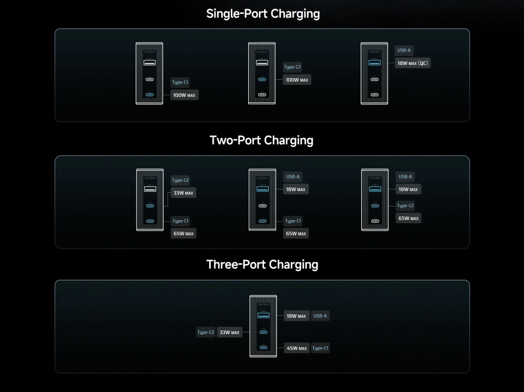 - USB-C: 5V/3A, 9V/3A, 11V/6.1A, 12V/3A, 15V/3A, 20V/5A, 100W max.