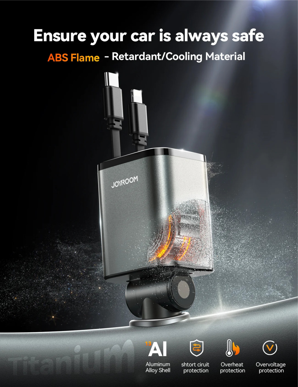 A Joyroom JR-CCL05 egy kompakt 4 az 1-ben autós töltő, amely gyors és kényelmes töltést biztosít akár négy eszköz számára is. Két beépített, visszahúzható 80 cm-es kábellel (USB-C és Lightning) és további USB-C és USB-A portokkal felszerelve tökéletes a családi kirándulásokhoz. Támogatja a 30W-os (PD/PPS) gyorstöltést és 57%-kal kisebb, mint a hagyományos, visszahúzható kábellel ellátott töltők. A 180°-ban elforgatható kialakításnak és az 1 másodperc alatt történő automatikus kábelvisszatekerésnek köszönhetően rendben tarthatja autóját. Az alumínium ház és a tűzálló anyagok minden körülmények között biztosítják a biztonságos használatot.