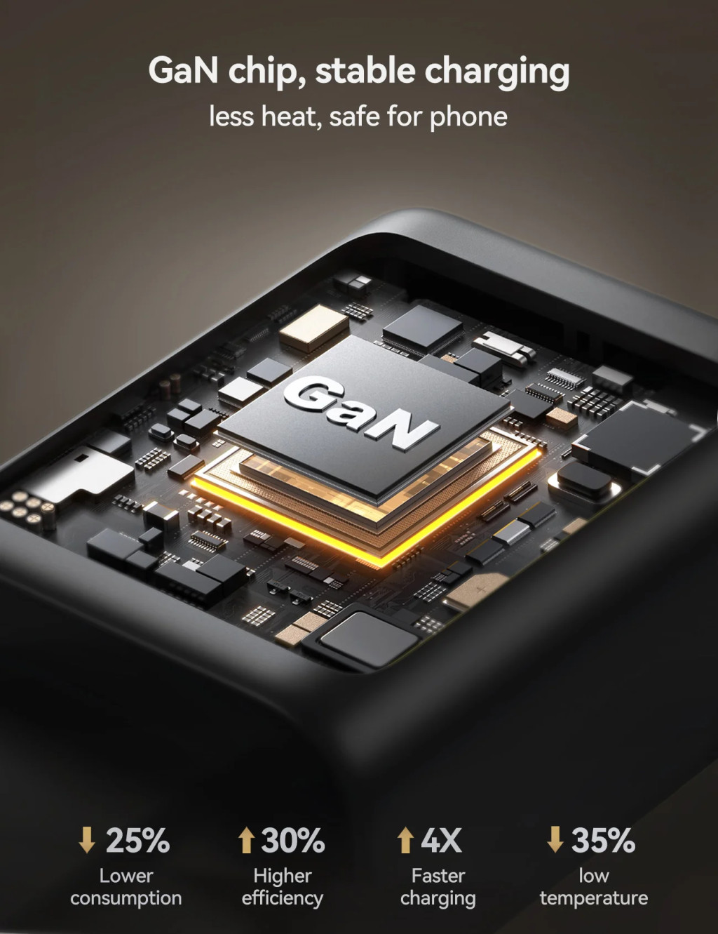 - GaN technológia: Stabil töltés minimális melegedés mellett a modern GaN chipek használatának köszönhetően.