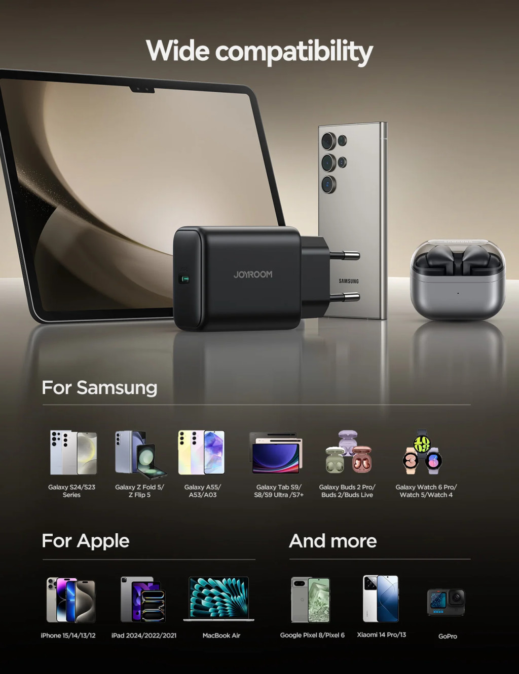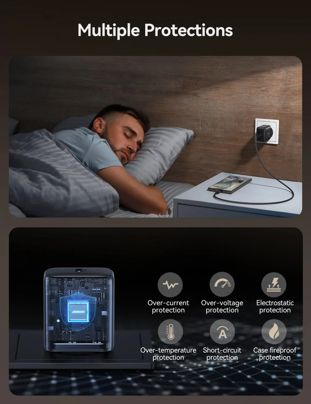 A töltő számos protokollal kompatibilis, beleértve az SFC 2.0, PD 3.0, QC 3.0 és PPS protokollokat, így univerzális megoldást kínál különböző márkájú okostelefonok és táblagépek számára. Beépített 6 pontos védelmével teljes biztonságot garantál, kiküszöbölve a túlmelegedés vagy a túlterhelés kockázatát. Könnyű és kompakt, ideális otthoni, irodai és utazási használatra. A Joyroom 45W GaN a legjobb választás azok számára, akik gyors, biztonságos és sokoldalú töltést várnak!