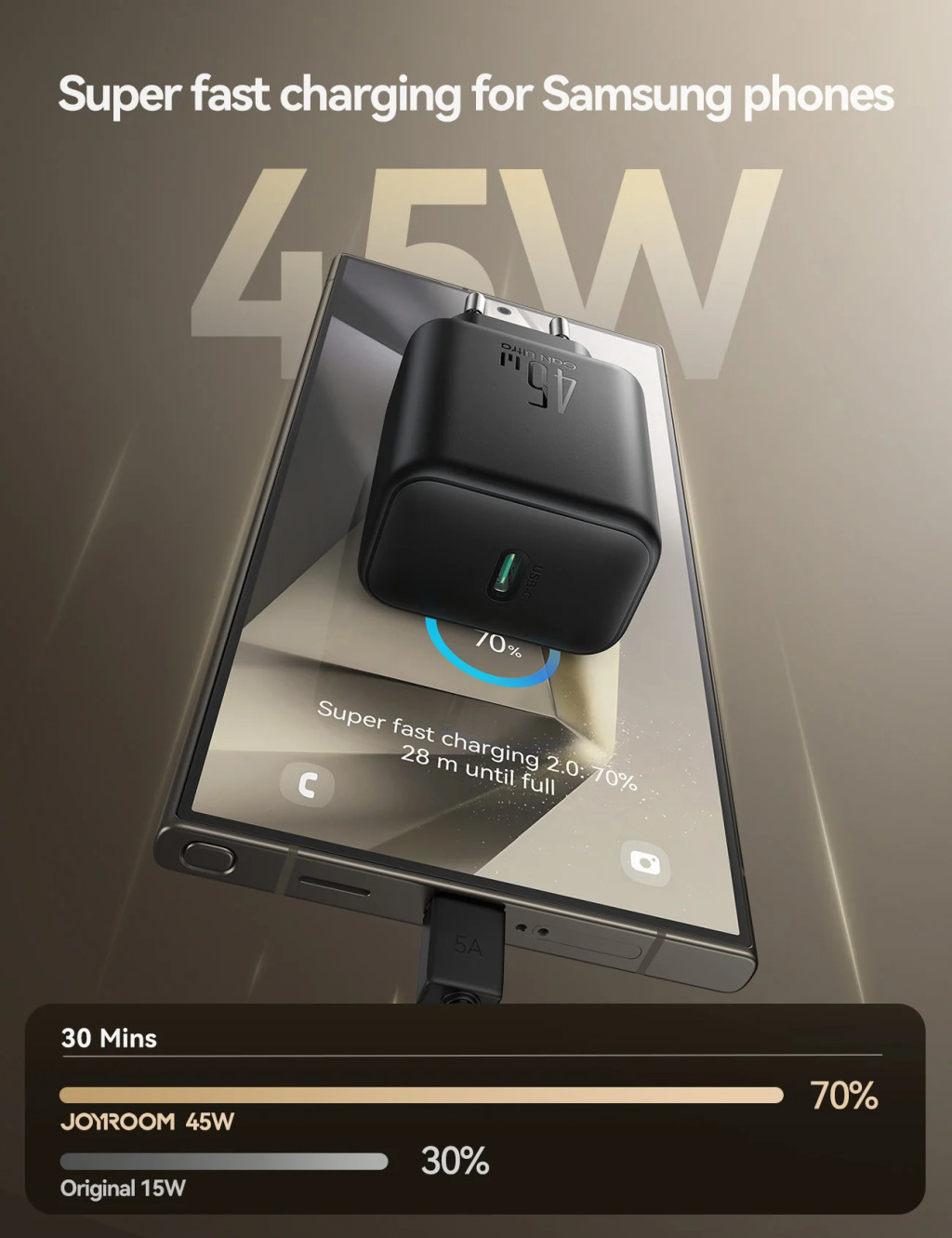 Joyroom 45W-os GaN töltő, amely páratlan sebességet és biztonságot nyújt készülékeinek töltéséhez. A Super Fast Charging 2.0 technológia támogatásának köszönhetően ez a töltő lehetővé teszi a legújabb Samsung Galaxy Ultra modellek gyors feltöltését – akár 70%-ig mindössze 28 perc alatt! Az innovatív GaN (gallium-nitrid) technológia minimálisra csökkenti az eszköz melegedését, biztosítva a stabilitást és a hatékonyságot minden használat során.