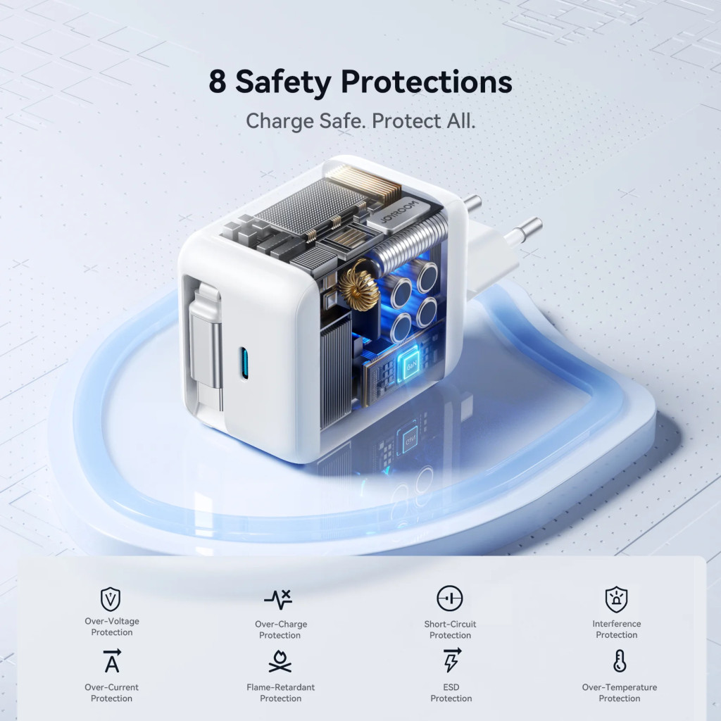 A Joyroom JR-TCL06 töltő egy innovatív megoldás, amely ötvözi a hatalmas teljesítményt, a modern GaN technológiát és a beépített USB-C kábel kényelmét. 67W-os teljesítménnyel gyorsan feltölt a laptopokat, táblagépeket és okostelefonokat – a MacBook Airt pedig mindössze 30 perc alatt akár 50%-ra. A beépített, 70 cm-es, visszahúzható mechanizmussal ellátott kábelt több mint 30 000 alkalommal tesztelték, biztosítva a tartósságot és a kényelmes használatot. A kettős GaN lapkakészlet minimalizálja a hőfelhalmozódást és növeli a biztonságot, míg nyolc beépített védelmi rendszer védi az eszközöket a túlfeszültségtől, a túltöltéstől és a rövidzárlattól. A töltő támogatja a legnépszerűbb gyorstöltési protokollokat (PD3.0, QC5.0, QC4.0+, PPS, UFCS és egyebek), így univerzális megoldás laptopokhoz, okostelefonokhoz és táblagépekhez. A visszahúzható csatlakozóval ellátott kompakt kialakításnak köszönhetően a JR-TCL06 ideális otthoni, irodai és utazási célokra.
