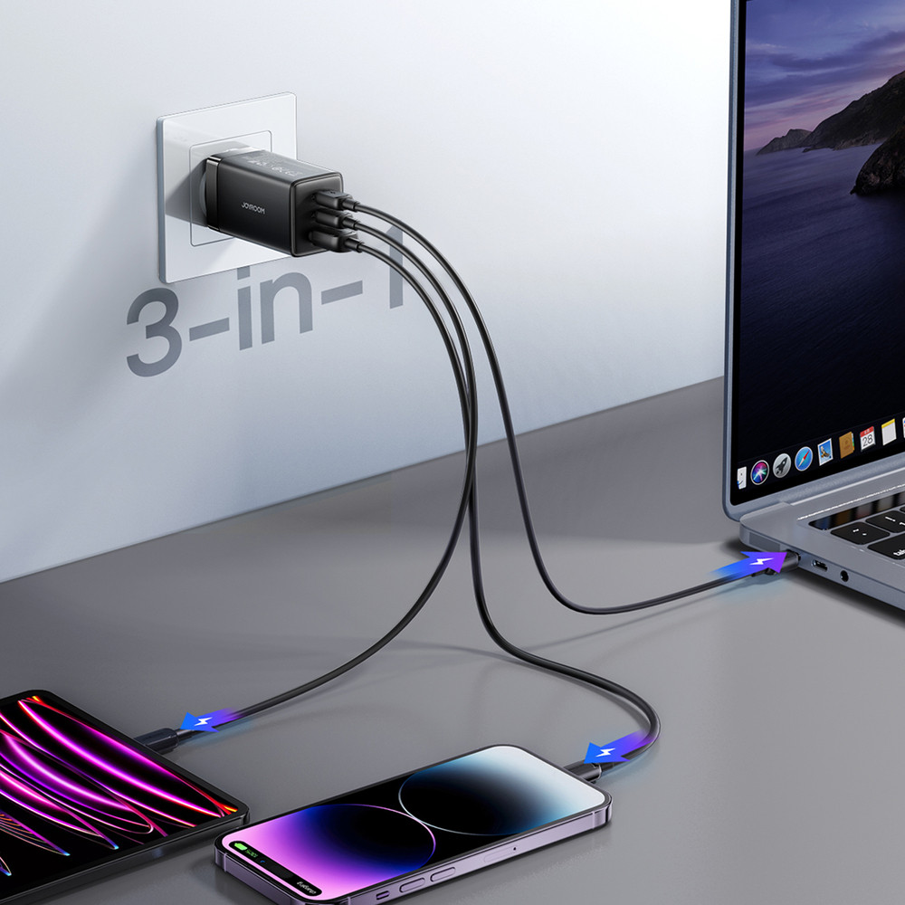 A Joyroom JR-TG10 egy nagy teljesítményű, 65W-os GaN fali töltő, amely akár három eszköz gyors és egyidejű töltését is lehetővé teszi. Két USB-C és egy USB-A csatlakozóval rendelkezik, így laptopokhoz, okostelefonokhoz és táblagépekhez egyaránt alkalmas, stabil és hatékony áramellátást biztosítva. A GaN technológia csökkenti a hőtermelést és a készülék méretét, míg a mellékelt 100W-os USB-C kábel tovább növeli a kényelmet. Ez a megoldás nagy teljesítményt, kompakt kialakítást és univerzális használatot ötvöz egyetlen eszközben.
