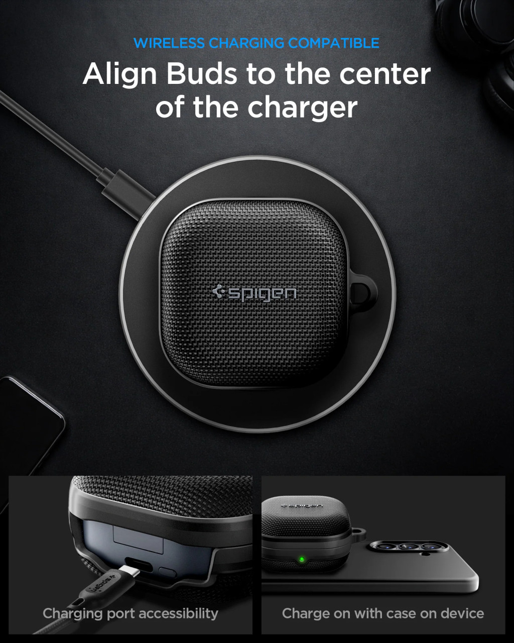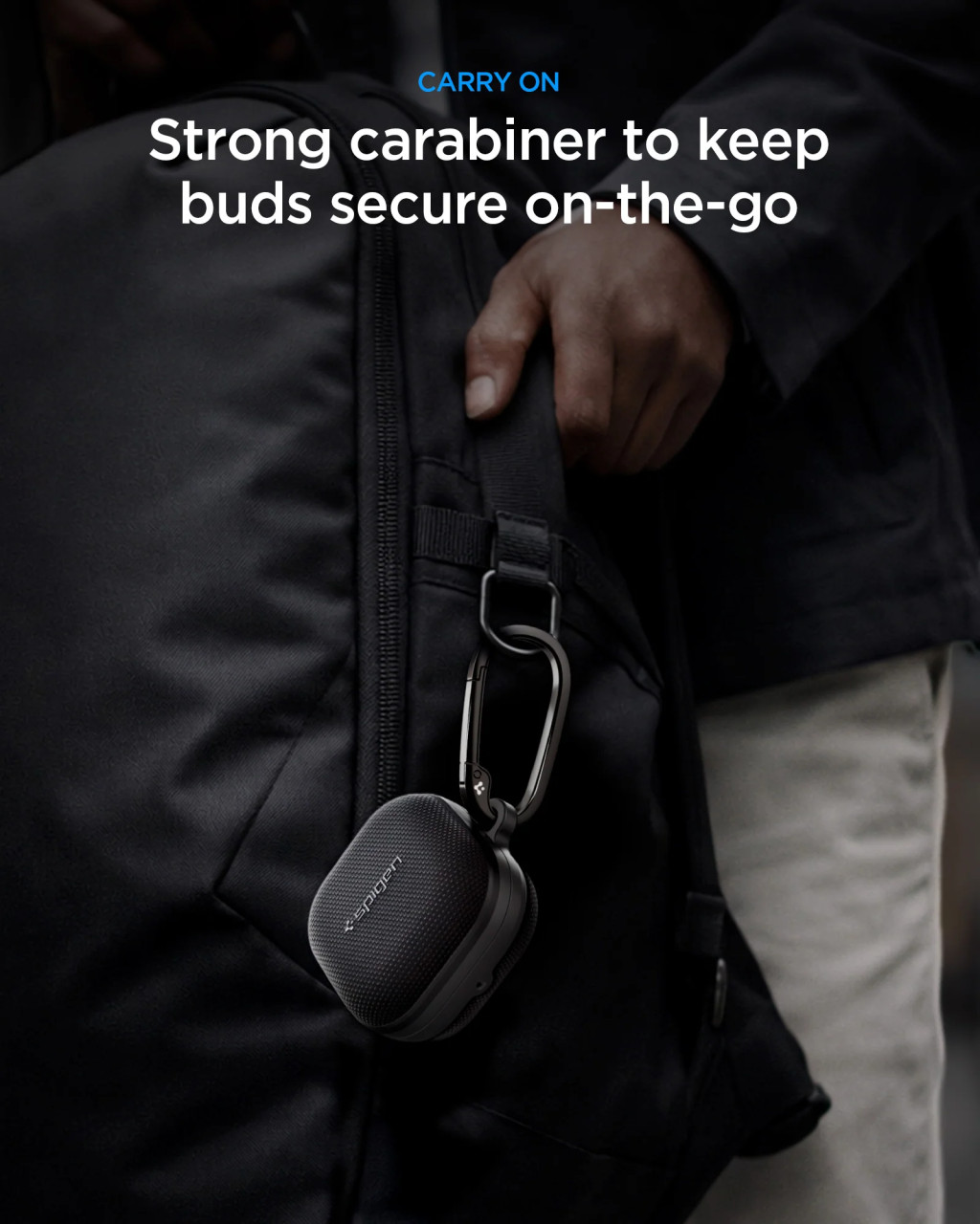 A készlet tartalmaz egy fém karabinert és kétoldalas ragasztószalagot is, amely még erősebb és stabilabb kapcsolatot biztosít a tok és a fülhallgató között. A karabiner segítségével a tokot kényelmesen rögzíthetjük hátizsákhoz, kulcsokhoz vagy táskához, így a fülhallgató mindig kéznél lesz. A tok teljes mértékben kompatibilis a vezeték nélküli töltéssel, így nem kell eltávolítani a fülhallgatók töltéséhez.