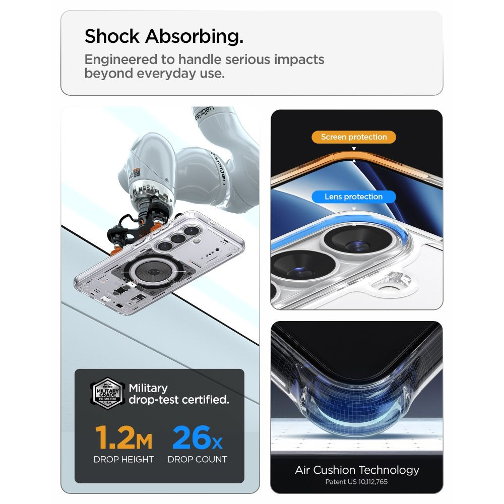 A termék ejtés tesztelésen esett át és megkapta a MIL STD 810G-516.6 tanúsítványt, ami azt jelenti, hogy 26 alkalommal ejtették le 1,2 méteres magasságból a készülék károsodása nélkül. Az összes Spigen termék kopásállóságát és pontos illeszkedését tesztelik, hogy biztosítsák a tokok kiváló minőségét.