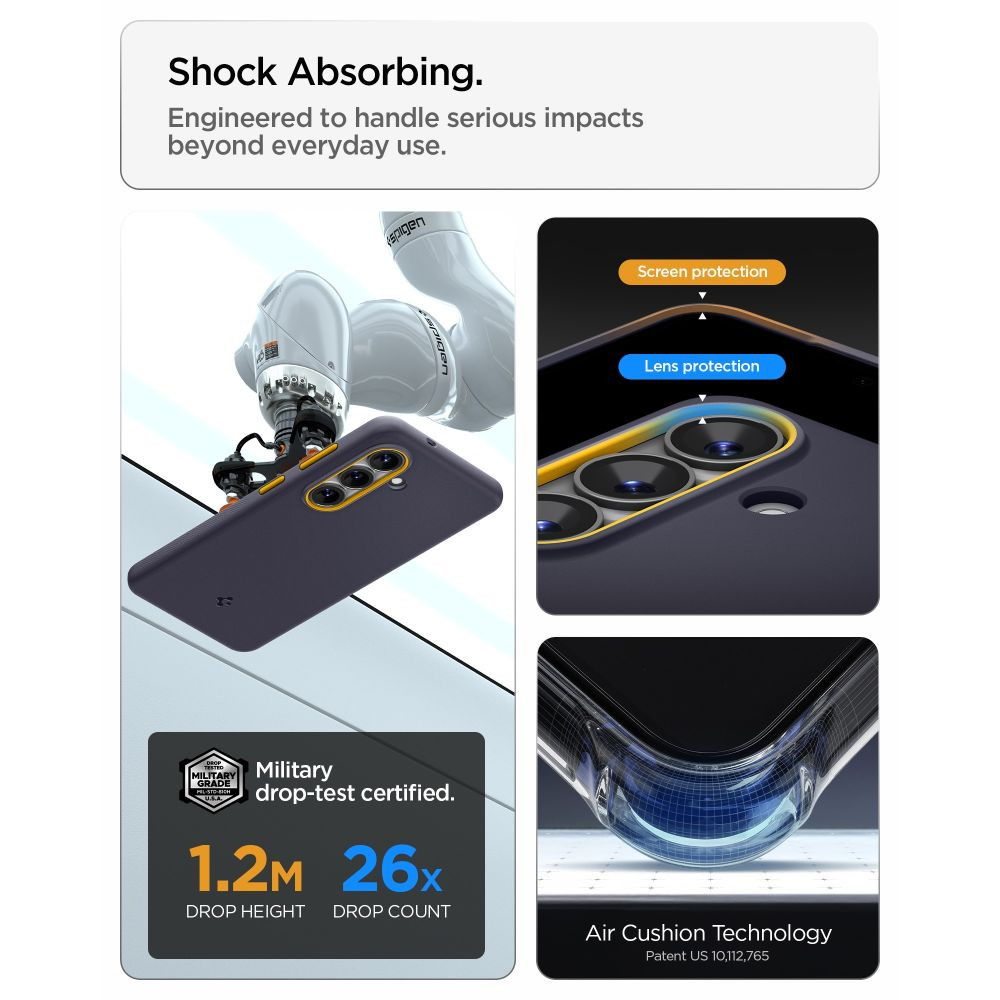 A kellemes tapintású, tartós poliuretán tok kiváló védelmet nyújt a karcolások és ujjlenyomatok ellen, míg a belső védőmintázat eloszlatja az ütések hatásait. A gyártó gondoskodott a sarkok Air Cushion technológiával történő megerősítéséről, tovább védve a készüléket esés esetén.