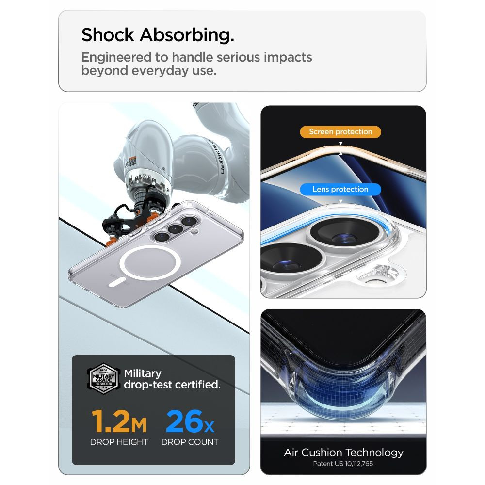 A termék ejtés tesztelésen esett át és megkapta a MIL STD 810G-516.6 tanúsítványt, ami azt jelenti, hogy 26 alkalommal ejtették le 1,2 méteres magasságból a készülék károsodása nélkül. Az összes Spigen termék kopásállóságát és pontos illeszkedését tesztelik, hogy biztosítsák a tokok kiváló minőségét.
