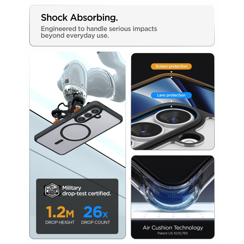 A termék ejtés tesztelésen esett át és megkapta a MIL STD 810G-516.6 tanúsítványt, ami azt jelenti, hogy 26 alkalommal ejtették le 1,2 méteres magasságból a készülék károsodása nélkül. Az összes Spigen termék kopásállóságát és pontos illeszkedését tesztelik, hogy biztosítsák a tokok kiváló minőségét.