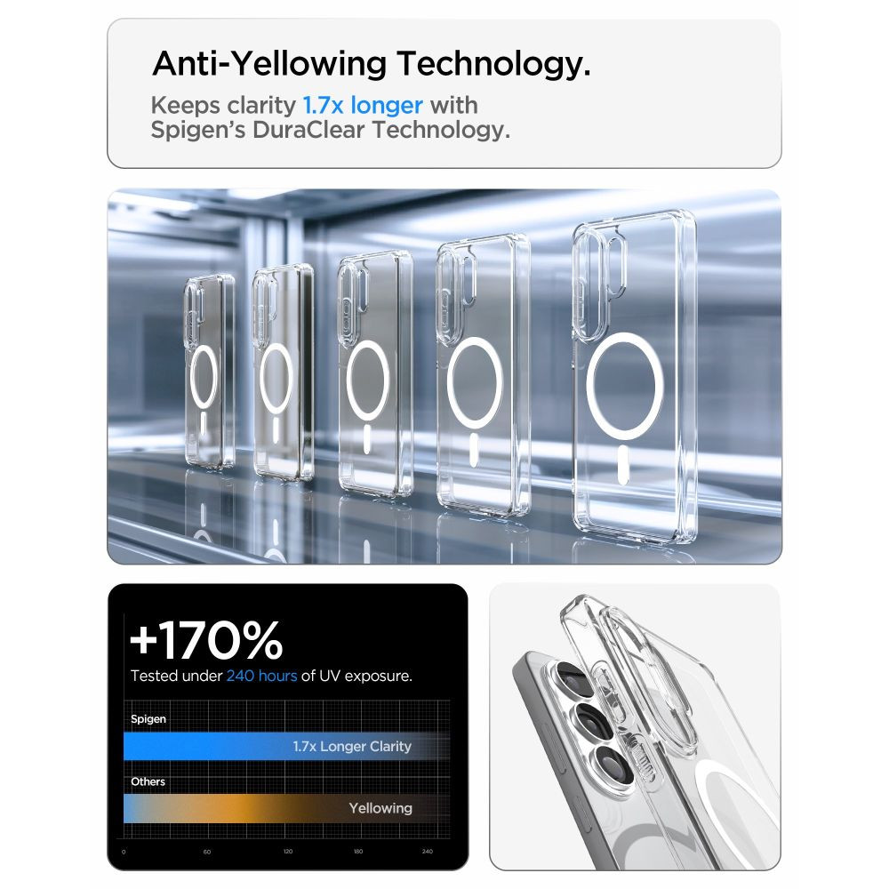 Spigen Ultra Hybrid MagFit tok, amely ötvözi a legjobb védelmet és esztétikát, így az okostelefonnak biztonságot és egyedi megjelenést  is biztosít. Egyedülálló hibrid szerkezetének (TPU + PC) köszönhetően egy tartós keretet és egy átlátszó panelt kombinál, így a telefon megőrzi eredeti kialakítását, miközben hatékonyan védve van a sérülésektől. A légpárnákkal megerősített sarkok hatékonyan elnyelik az ütéseket, így további védelmet nyújtanak egy ejtés esetén.