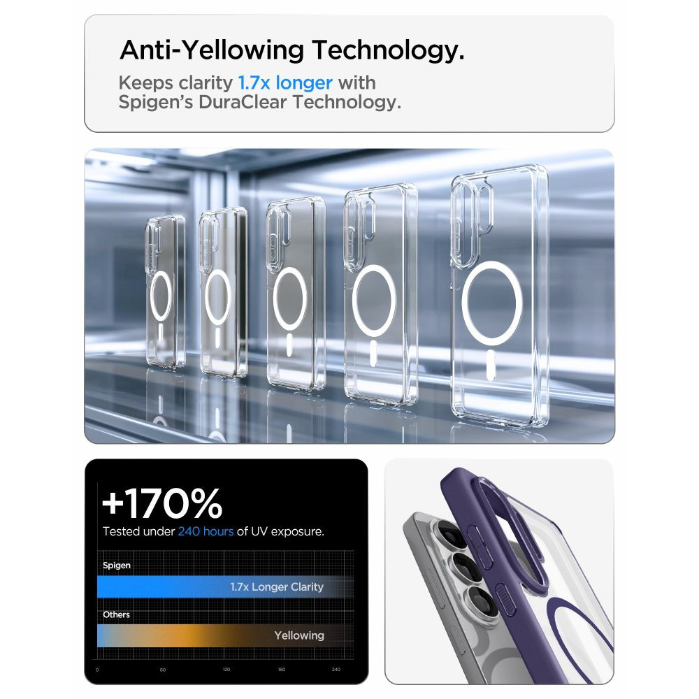 Spigen Ultra Hybrid MagFit tok, amely ötvözi a legjobb védelmet és esztétikát, így az okostelefonnak biztonságot és egyedi megjelenést  is biztosít. Egyedülálló hibrid szerkezetének (TPU + PC) köszönhetően egy tartós keretet és egy átlátszó panelt kombinál, így a telefon megőrzi eredeti kialakítását, miközben hatékonyan védve van a sérülésektől. A légpárnákkal megerősített sarkok hatékonyan elnyelik az ütéseket, így további védelmet nyújtanak egy ejtés esetén.