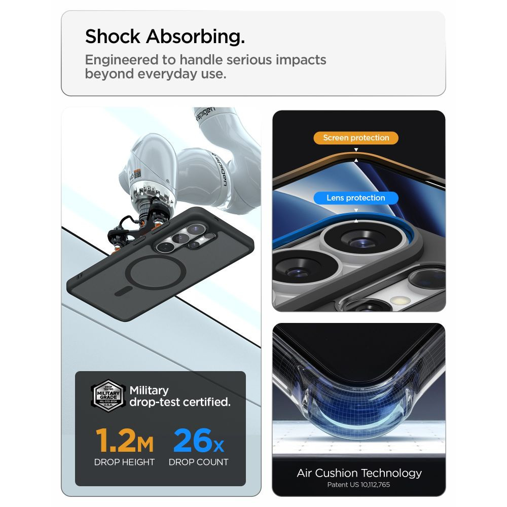 Spigen Ultra Hybrid MagFit tok, amely ötvözi a legjobb védelmet és esztétikát, így az okostelefonnak biztonságot és egyedi megjelenést  is biztosít. Egyedülálló hibrid szerkezetének (TPU + PC) köszönhetően egy tartós keretet és egy átlátszó panelt kombinál, így a telefon megőrzi eredeti kialakítását, miközben hatékonyan védve van a sérülésektől. A légpárnákkal megerősített sarkok hatékonyan elnyelik az ütéseket, így további védelmet nyújtanak egy ejtés esetén.