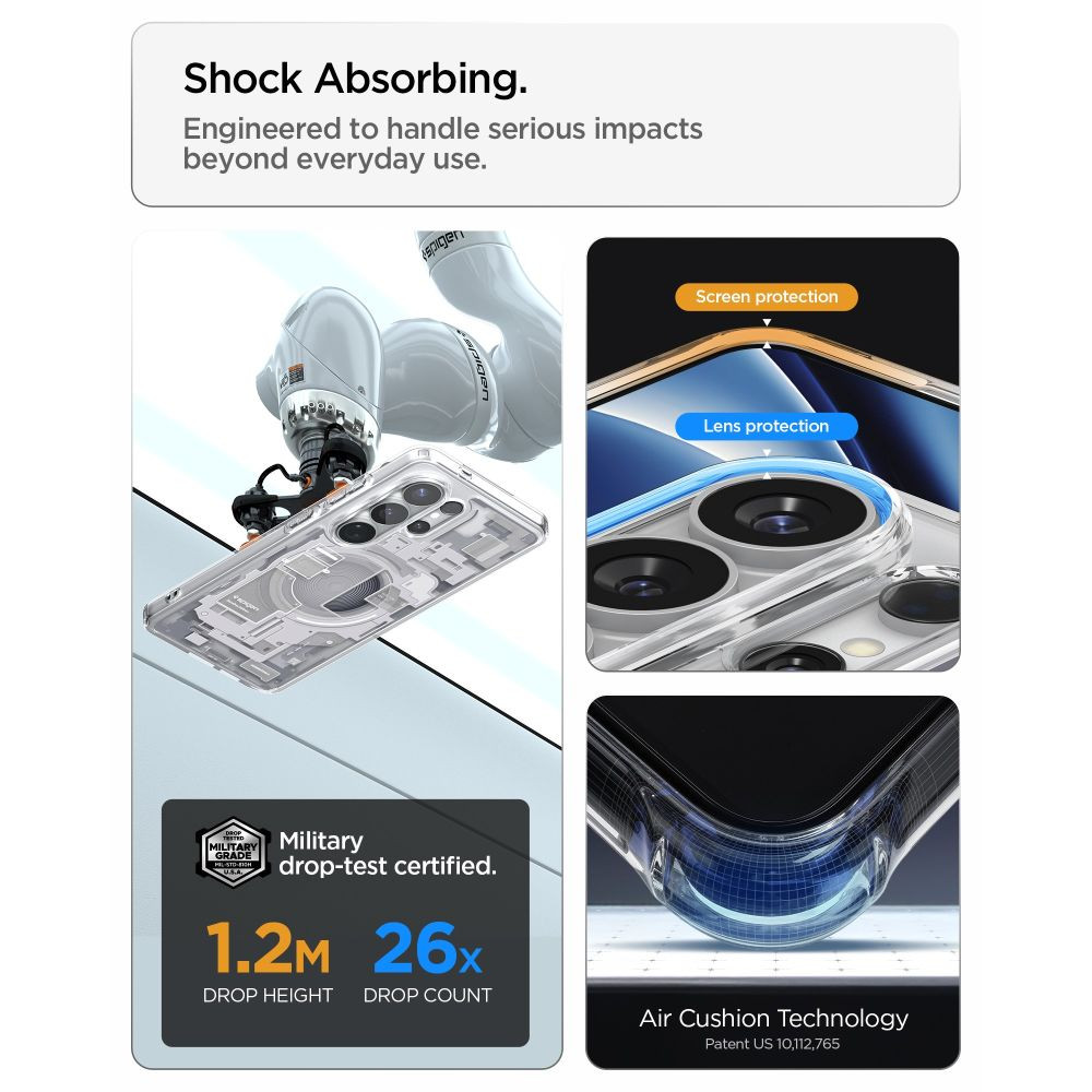 A termék ejtés tesztelésen esett át és megkapta a MIL STD 810G-516.6 tanúsítványt, ami azt jelenti, hogy 26 alkalommal ejtették le 1,2 méteres magasságból a készülék károsodása nélkül. Az összes Spigen termék kopásállóságát és pontos illeszkedését tesztelik, hogy biztosítsák a tokok kiváló minőségét.