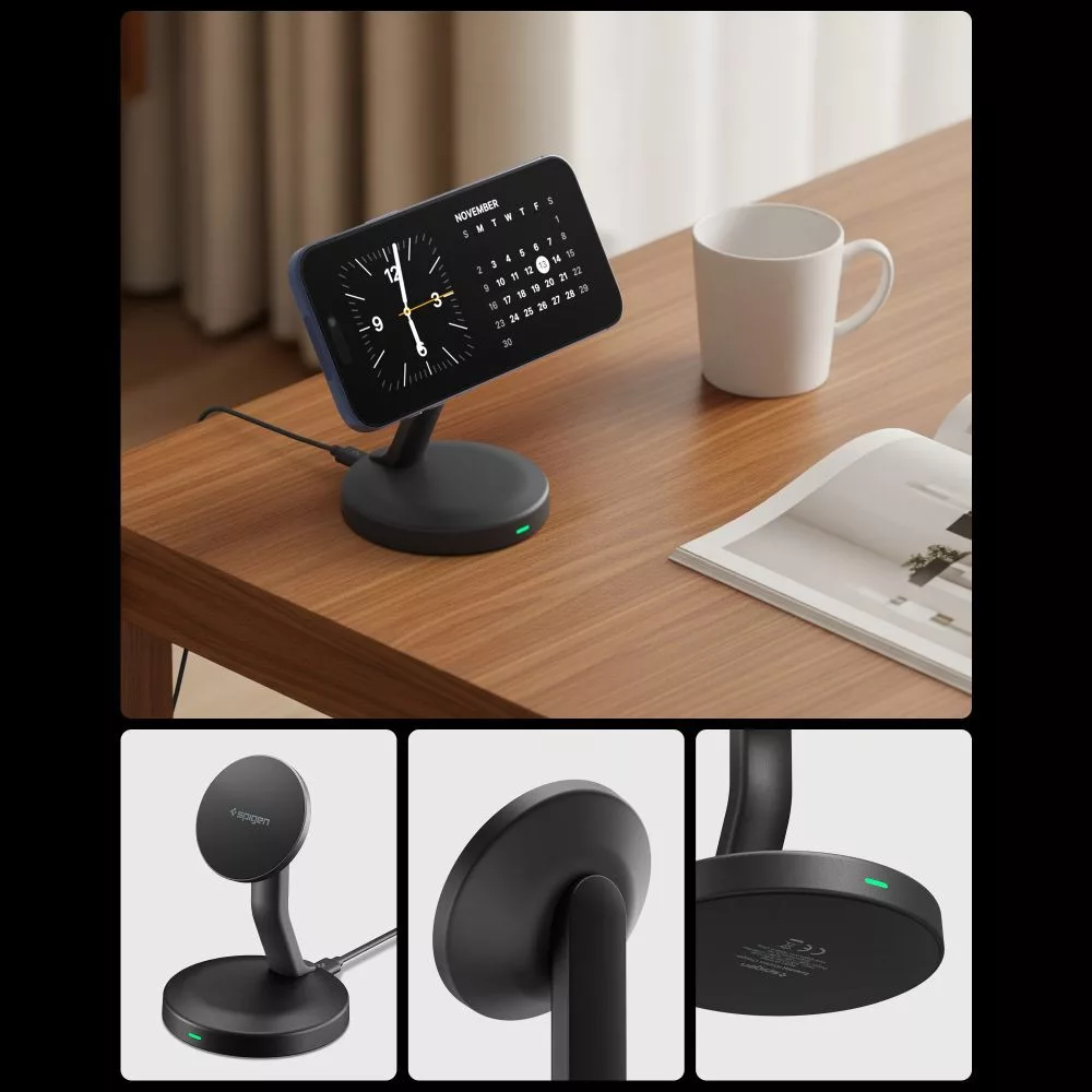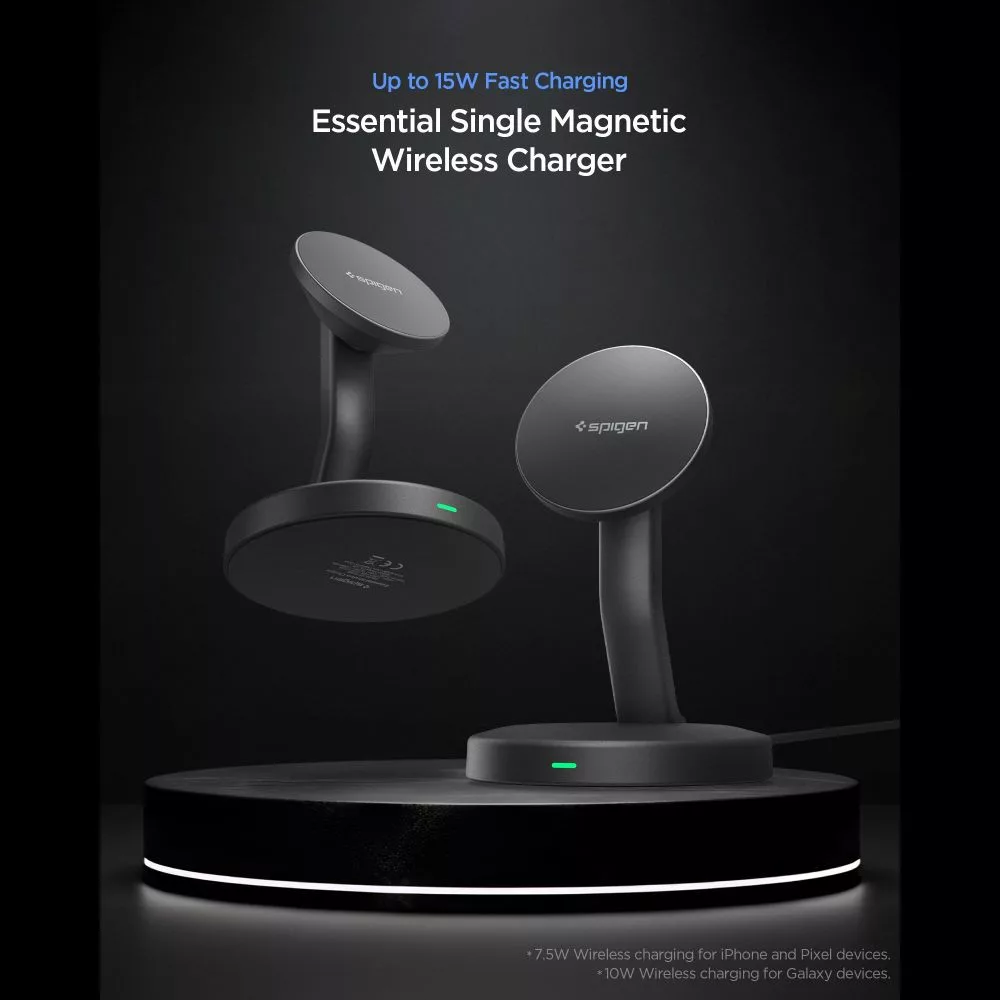 A Spigen Essential vezeték nélküli töltő egy kompakt, MagSafe technológiával ellátott eszköz, amely akár 15W-os töltési teljesítményt biztosít. Az N52-es mágnesekkel felszerelve rendkívül erős és stabil rögzítést garantál a telefon számára töltés közben. Mivel az okostelefon álló és fekvő helyzetben egyaránt elhelyezhető, a töltő ideális tartalom böngészéshez, videohívásokhoz vagy videók streameléséhez, miközben a készülék egyidejűleg töltődik.