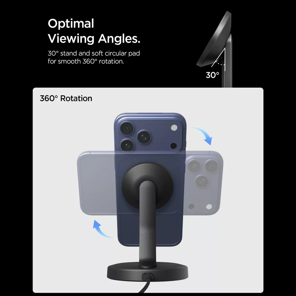 A 30°-os, rögzített dőlésszögű ergonómikus állvány lehetővé teszi a telefon kényelmes, kézmentes használatát töltés közben. Ez a látószög optimális üzenetek olvasásához, közösségi média böngészéséhez vagy videók megtekintéséhez anélkül, hogy a készüléket a kézben kellene tartani. Az állvány stabil helyzetben tartja a telefont, kiküszöbölve a kicsúszás vagy felborulás kockázatát.
