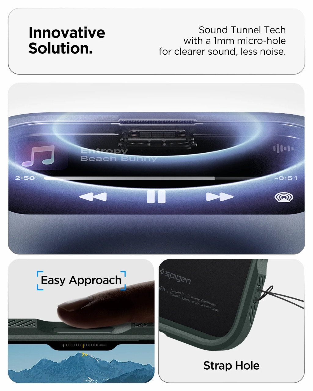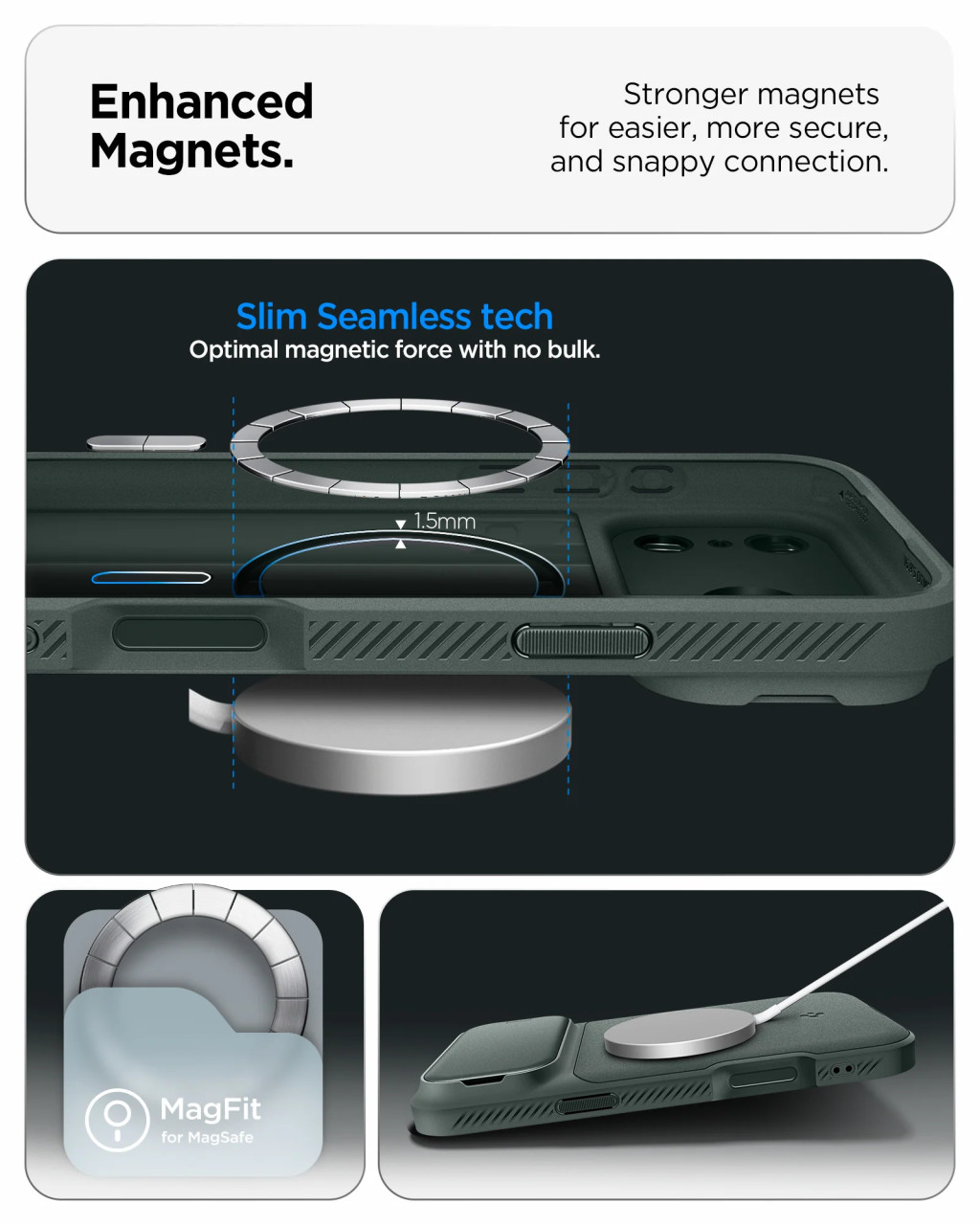 A Spigen Optik Armor MagFit egy hibrid tok, amelyet a maximális okostelefon védelem érdekében terveztek. Kialakítása rugalmas TPU-t és masszív PC-t kombinál. Ez a praktikus tok hatékonyan védi a lencsét a karcolásoktól és más, a mindennapi használat során előforduló sérülésektől. A beépített légpárnák tovább csillapítják az ütéseket és védik a készüléket a sérülésektől. A matt, csúszásmentes felület megakadályozza, hogy a telefon kicsússzon a kézből, míg a teljes MagSafe kompatibilitás pedig lehetővé teszi a gyors vezeték nélküli töltést és a mágneses kiegészítők használatát.