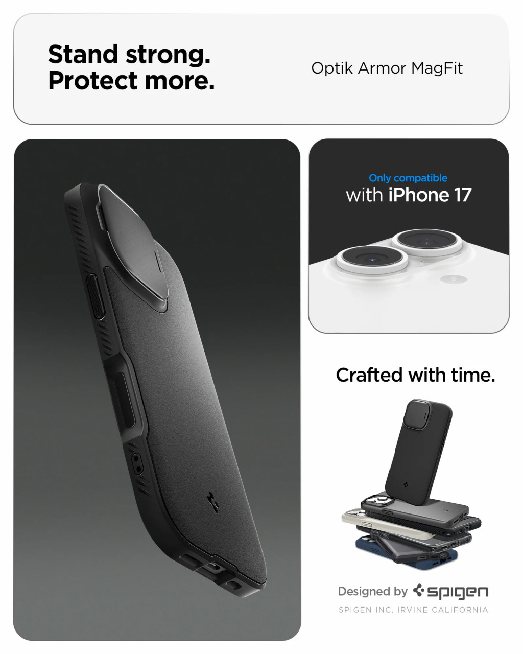 A Spigen Optik Armor MagFit egy hibrid tok, amelyet a maximális okostelefon védelem érdekében terveztek. Kialakítása rugalmas TPU-t és masszív PC-t kombinál. Ez a praktikus tok hatékonyan védi a lencsét a karcolásoktól és más, a mindennapi használat során előforduló sérülésektől. A beépített légpárnák tovább csillapítják az ütéseket és védik a készüléket a sérülésektől. A matt, csúszásmentes felület megakadályozza, hogy a telefon kicsússzon a kézből, míg a teljes MagSafe kompatibilitás pedig lehetővé teszi a gyors vezeték nélküli töltést és a mágneses kiegészítők használatát.