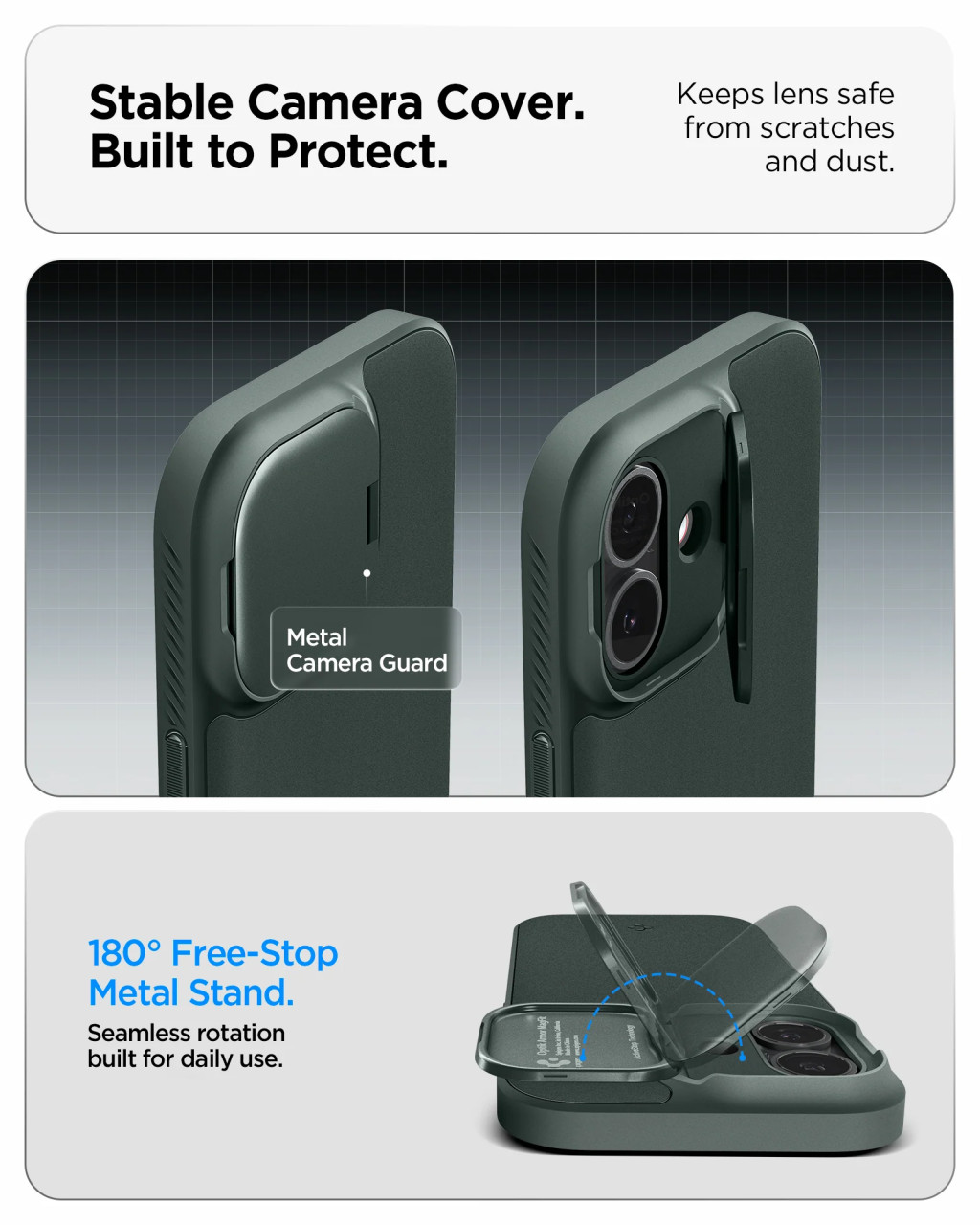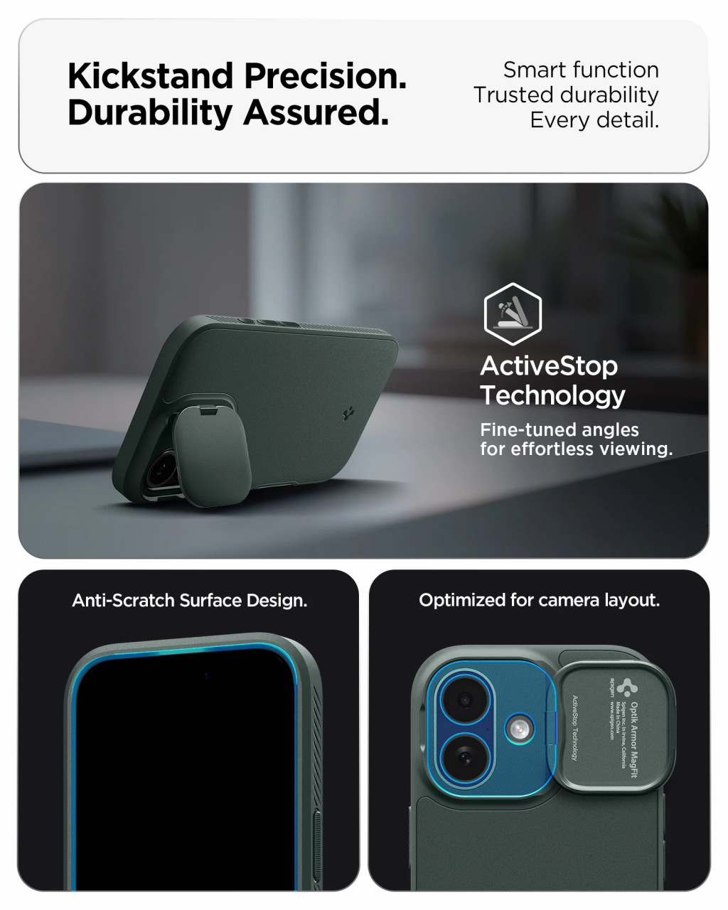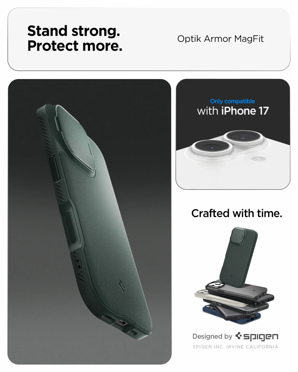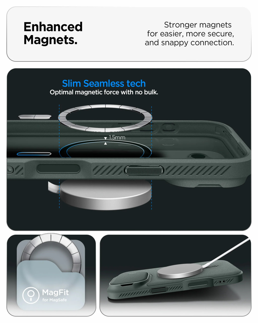 A Spigen Optik Armor MagFit egy hibrid tok, amelyet a maximális okostelefon védelem érdekében terveztek. Kialakítása rugalmas TPU-t és masszív PC-t kombinál. Ez a praktikus tok hatékonyan védi a lencsét a karcolásoktól és más, a mindennapi használat során előforduló sérülésektől. A beépített légpárnák tovább csillapítják az ütéseket és védik a készüléket a sérülésektől. A matt, csúszásmentes felület megakadályozza, hogy a telefon kicsússzon a kézből, míg a teljes MagSafe kompatibilitás pedig lehetővé teszi a gyors vezeték nélküli töltést és a mágneses kiegészítők használatát.